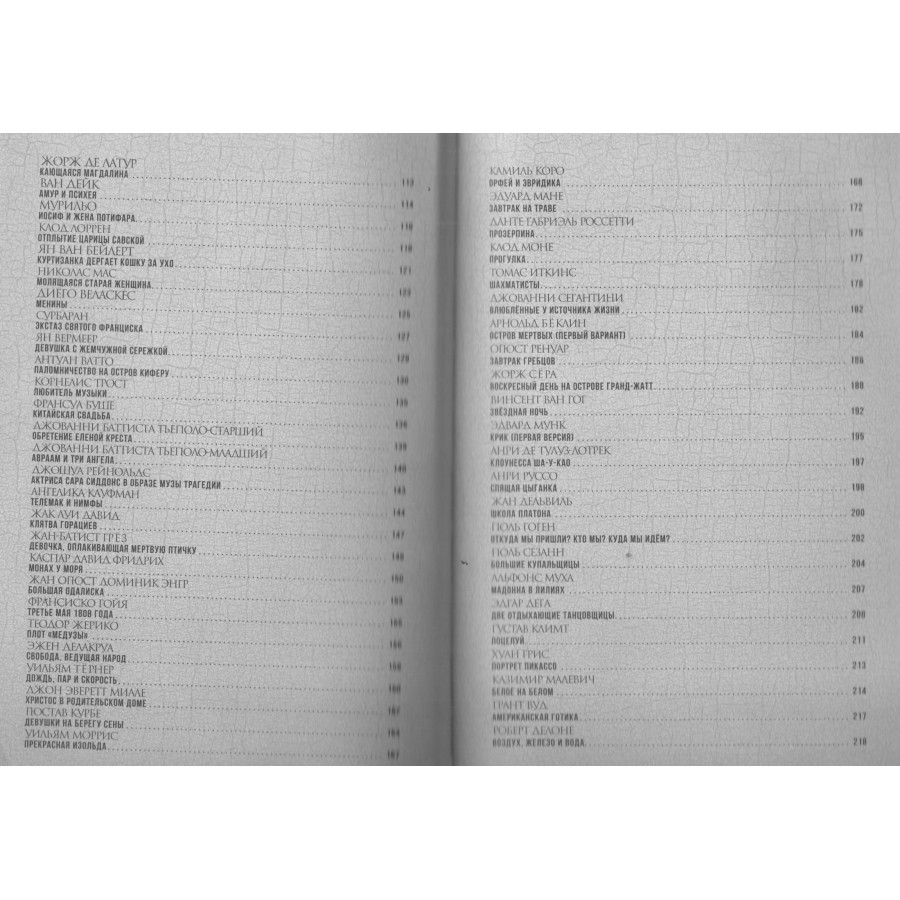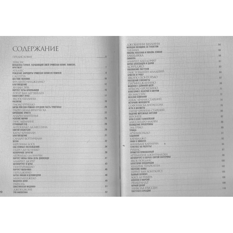 В издании представлены произведения мастеров, таких как Зевксис, Леонардо да Винчи, Рафаэль, Рембрандт, Караваджо и других. Каждая картина сопровождается кратким описанием и датировкой, что помогает познакомиться с историей искусства через призму выдающихся полотен.