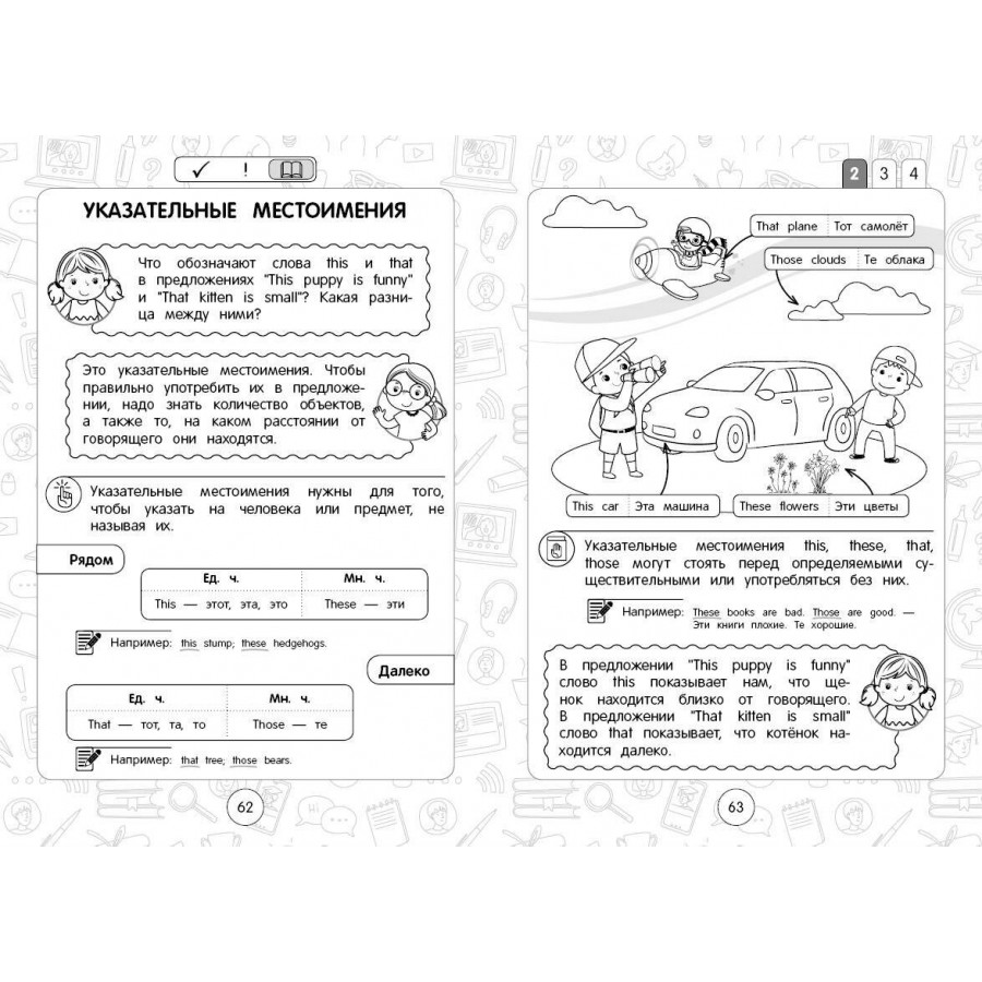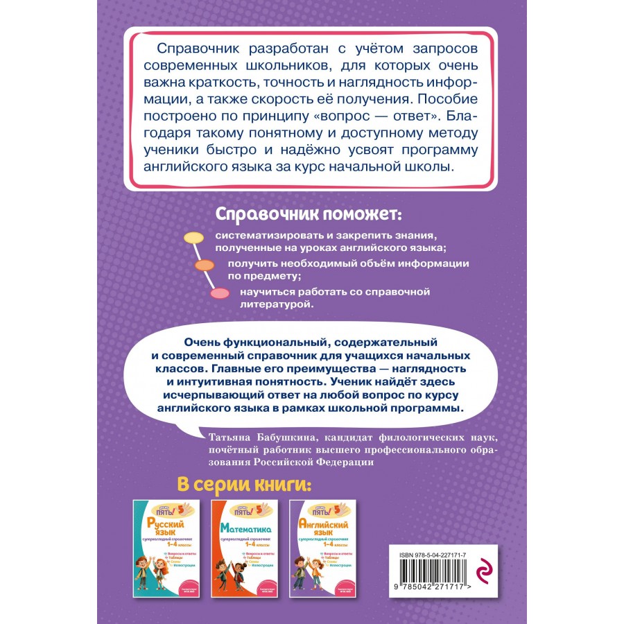 Справочник разработан в полном соответствии с требованиями ФГОС начального общего образования. Это прекрасный подарок детям на 1 сентября, который поможет им успешно справляться с домашними заданиями и освоить программу английского языка. Книга полезна не только ученикам начальной школы, но и их родителям, желающим помочь с выполнением домашних заданий, а также педагогам, стремящимся сделать уроки английского языка более наглядными и интересными. Этот универсальный справочник — отличный помощник для подготовки к ВПР, контрольным и самостоятельным работам!