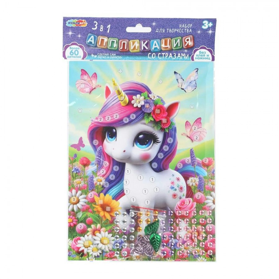 Набор для творчества — аппликация 3 в 1 из картона, ЭВА и страз «Единорог» ТМ «Мульти Арт» — отличный подарок для ребёнка, который будет способствовать развитию его творческих способностей.