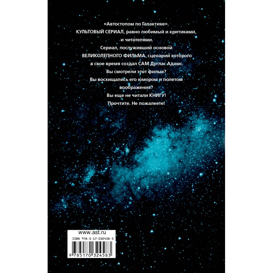 "Автостопом по Галактике". Культовый сериал, равно любимый и критиками, и читателями. Сериал, послуживший основой великолепного фильма, сценарий которого в свое время создал сам Дуглас Адамс. Вы смотрели этот фильм? Вы восхищались его юмором и полетом воображения? Вы еще не читали книгу?Прочтите. Не пожалеете!######