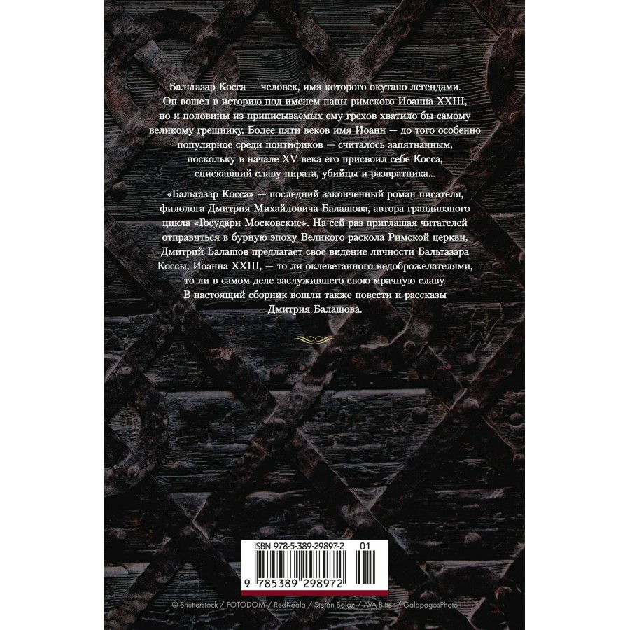 «Бальтазар Косса» — последний законченный роман, писателя, филолога Дмитрия Михайловича Балашова, автора грандиозного цикла «Государи Московские». На сей раз приглашая читателей отправиться в бурную эпоху Великого раскола Римской церкви, Дмитрий Балашов предлагает свое видение личности Бальтазара Коссы, Иоанна XXIII, — то ли оклеветанного недоброжелателями, то ли в самом деле заслужившего свою чудовищную биографию.