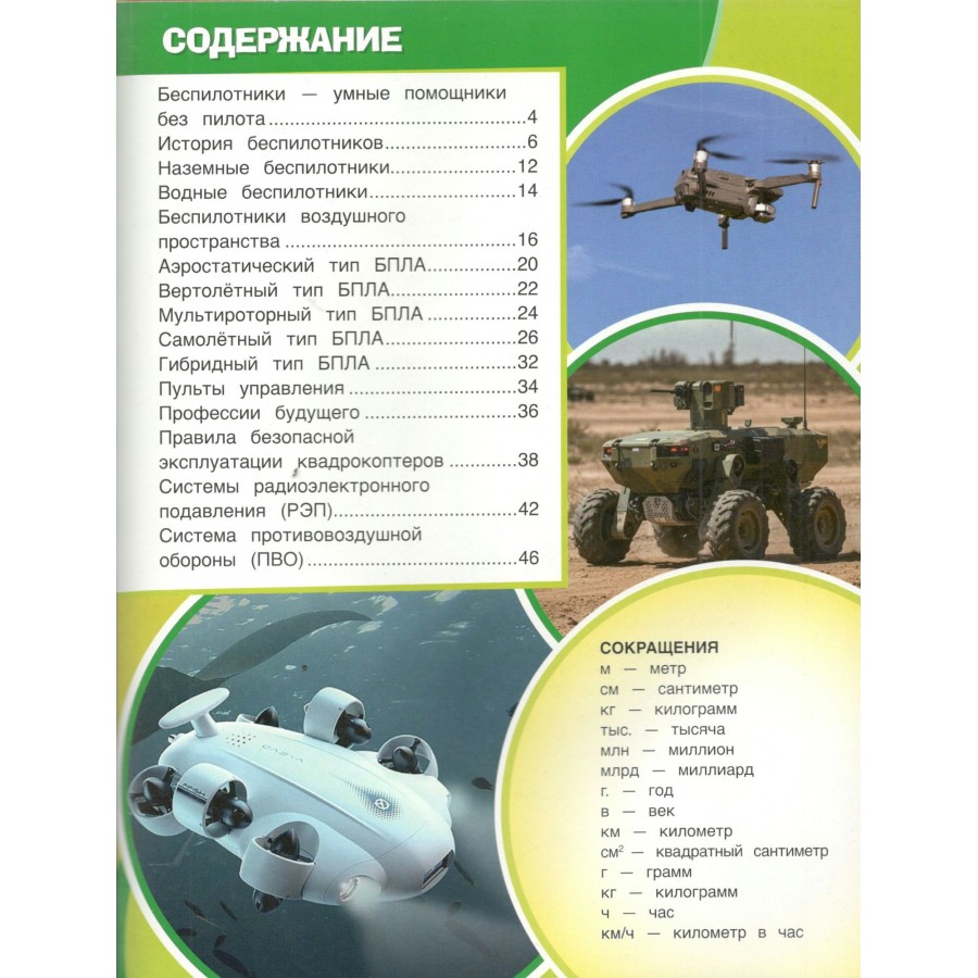 Эта энциклопедия познакомит юного читателя с различными типами беспилотных аппаратов, используемых как в воздушном пространстве, так и на земле и даже под водой; расскажет о том, где применяются беспилотники, каковы их особенности, правила эксплуатации, достоинства и недостатки. Зрелищные и яркие фото привлекут внимание ребёнка, помогут в лёгкой форме усвоить новую информацию.