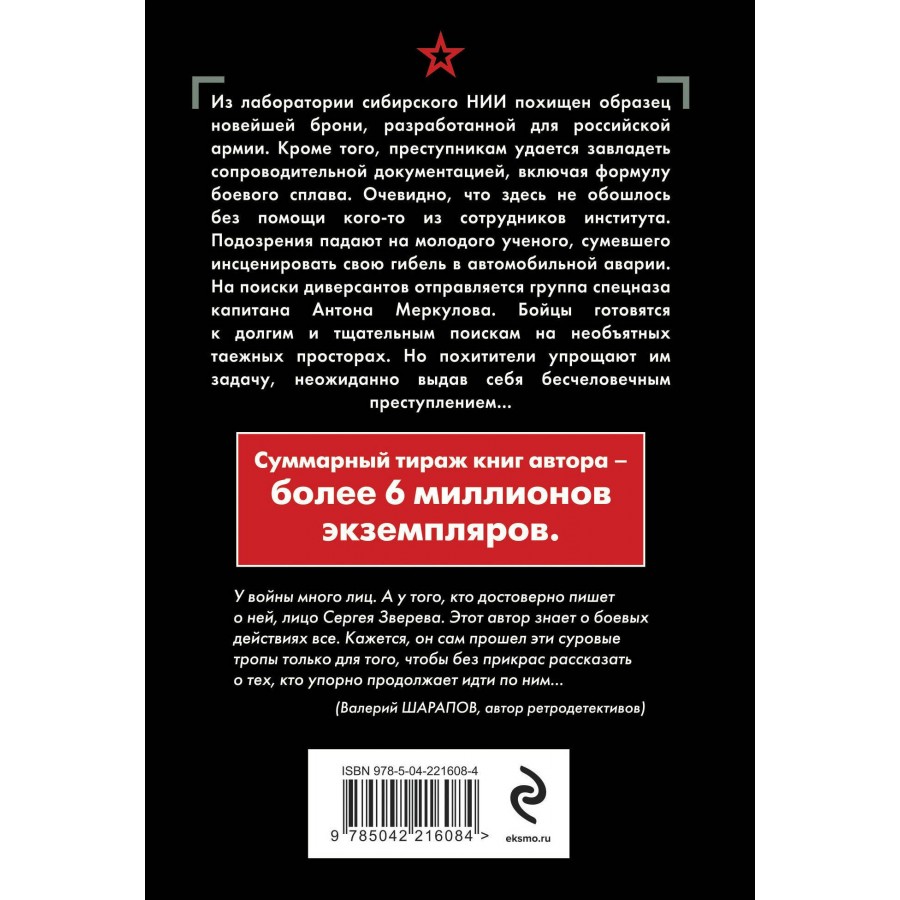 Из лаборатории сибирского НИИ похищен образец новейшей брони, разработанной для российской армии. Кроме того, преступникам удается завладеть сопроводительной документацией, включая формулу боевого сплава. Очевидно, что здесь не обошлось без помощи кого-то из сотрудников института. Подозрения падают на молодого ученого, сумевшего инсценировать свою гибель в автомобильной аварии. На поиски диверсантов отправляется группа спецназа капитана Антона Меркулова. Бойцы готовятся к долгим и тщательным поискам на необъятных таежных просторах. Но похитители упрощают им задачу, неожиданно выдав себя бесчеловечным преступлением...