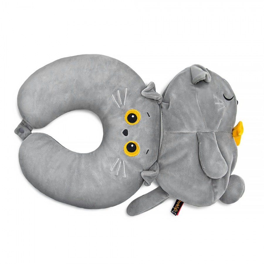Очень необычная, но очень удобная подушка Басик, сшитая из серого спандекса. Подушка с вышитой мордочкой Басика предназначена для удобства в поездках и полётах на самолёте. Хорошо ложится на шею и застёгивается на кнопку спереди. Такая подушка легко убирается в кота-игрушку. На спине кота-игрушки вшита зип-молния, чтобы удобно было убирать и доставать нашейную подушку. У кота-игрушки спящие глазки, фирменный галстук бабочка и петелька с кнопкой сверху. Петелька служит для того, чтобы удобно было закрепить подушку-игрушку, например, на сумке. Игрушка без индивидуальной упаковки