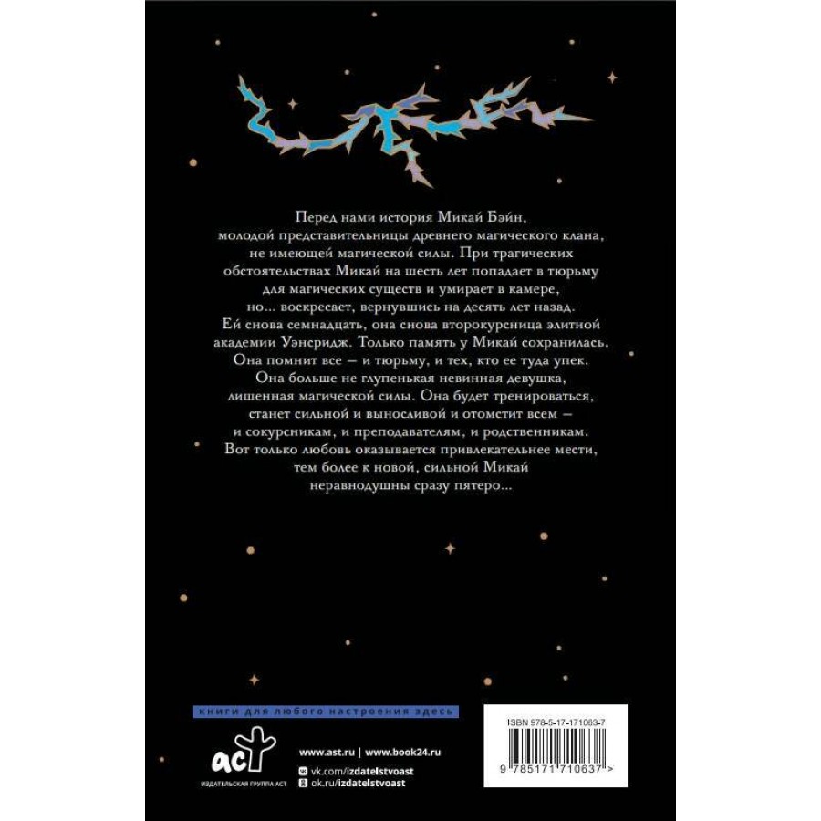 Перед нами история Мики Бэйн, молодой представительницы древнего магического клана, не имеющей магической силы. При трагических обстоятельствах Мика на шесть лет попадает в тюрьму для магических существ и умирает в камере, но… воскресает, вернувшись на десять лет назад. Ей снова семнадцать, она снова второкурсница элитной академии Венсридж. Только память у Мики сохранилась. Она помнит все – и тюрьму, и тех, кто ее туда упек. Она больше не глупенькая, невинная девушка, лишенная магической силы. Она будет тренироваться, станет сильной и выносливой и отомстит всем – и сокурсникам, и преподавателям, и родственникам. Вот только любовь оказывается привлекательнее мести, тем более к новой сильной Мике неравнодушны сразу пятеро…