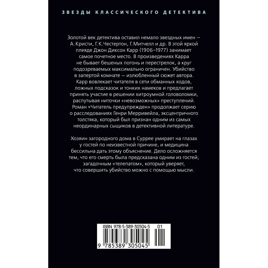 Золотой век детектива оставил немало звездных имен — А. Кристи, Г. К. Честертон, Г. Митчелл и др. В этой яркой плеяде Джон Диксон Карр (1906–1977) занимает самое почетное место. В произведениях Карра не бывает бешеных погонь и перестрелок, а круг подозреваемых максимально ограничен. Убийство в запертой комнате — излюбленный сюжет автора. Карр вовлекает читателя в сети обманных ходов, ложных подсказок и тонких намеков и предлагает принять участие в решении хитроумной головоломки, распутывая ниточки «невозможных» преступлений.