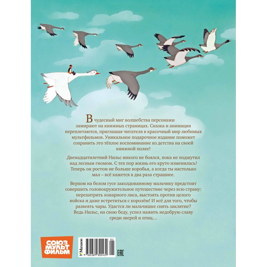 Верхом на белом гусе заколдованному мальчику предстоит совершить головокружительное путешествие через всю страну: перехитрить коварного лиса, выстоять против целого войска и даже встретиться с королём! И всё для того, чтобы развеять чары. Удастся ли мальчишке снять заклятие? Ведь Нильс, на свою беду, успел нажить недобрую славу среди зверей и птиц…