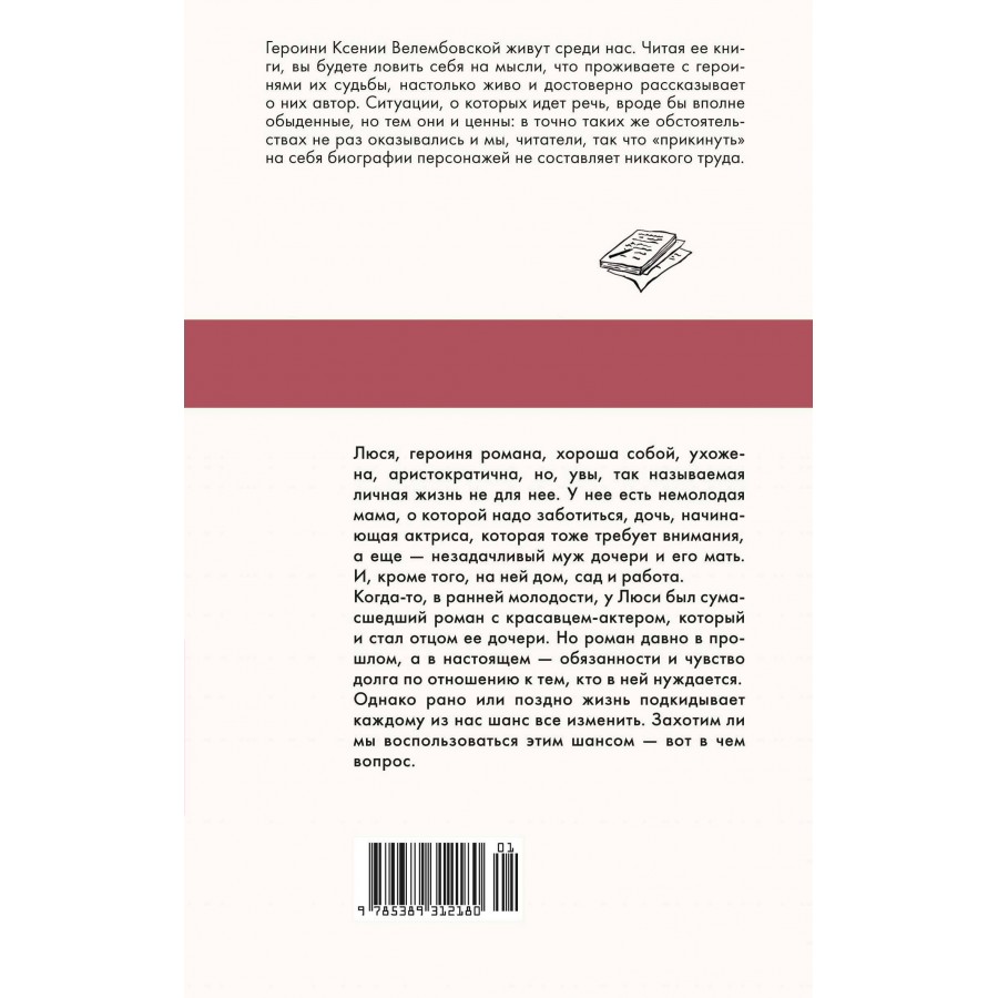 Ксения Велембовская - прозаик, автор нескольких книг. "Мысль семейная" - та тема, которая ее интересует больше всего и которую она блистательно раскрывает в своих произведениях. Героини Ксении Велембовской живут среди нас. Читая ее книги, вы будете ловить себя на мысли, что проживаете с героинями их судьбы, настолько живо и достоверно рассказывает о них автор. Житейские ситуации, о которых идет речь, вроде бы вполне обыденные, но тем они и ценны: в точно таких же обстоятельствах не раз оказывались и мы, читатели, так что прикинуть на себя биографии персонажей не составляет никакого труда.