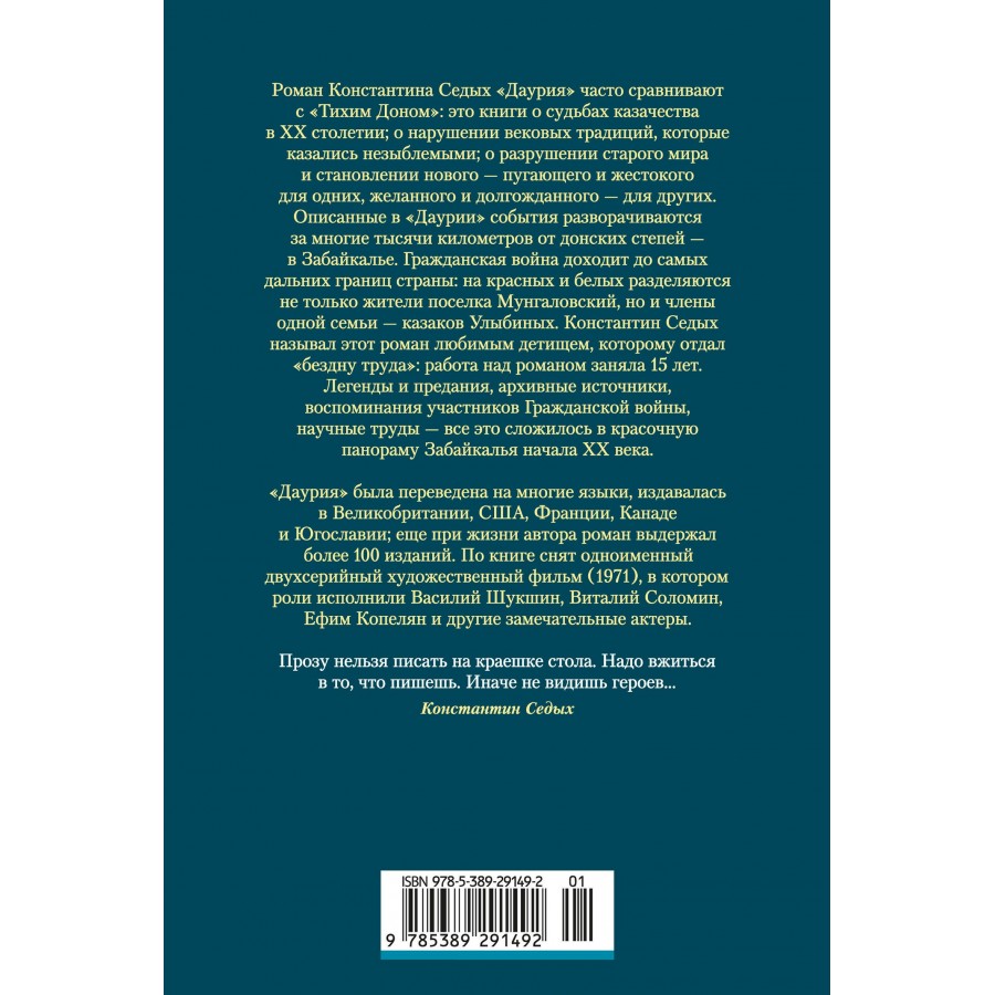 «Даурию» часто сравнивают с «Тихим Доном»: это книги о судьбах казачества в XX столетии; о нарушении вековых традиций, которые казались незыблемыми; о разрушении старого мира и становлении нового — пугающего и жестокого для одних, желанного и долгожданного — для других. Описанные в «Даурии» события разворачиваются за многие тысячи километров от донских степей — в Забайкалье. Гражданская война доходит до самых дальних границ страны: на красных и белых разделяются не только жители станицы Мунгаловской, но и члены одной семьи — казаков Улыбиных. Константин Седых называл этот роман любимым детищем, которому отдал «бездну труда»: работа над романом заняла 15 лет. Легенды и предания, архивные источники, воспоминания участников Гражданской войны, научные труды — всё это сложилось в красочную панораму Забайкалья начала XX века. «Даурия» была переведена на многие языки, издавалась в Великобритании, США, Франции, Канаде и Югославии; еще при жизни автора роман выдержал более 100 изданий. По книге снят одноименный двухсерийный художественный фильм (1971), в котором роли исполнили Василий Шукшин, Виталий Соломин, Ефим Копелян и другие замечательные актеры.