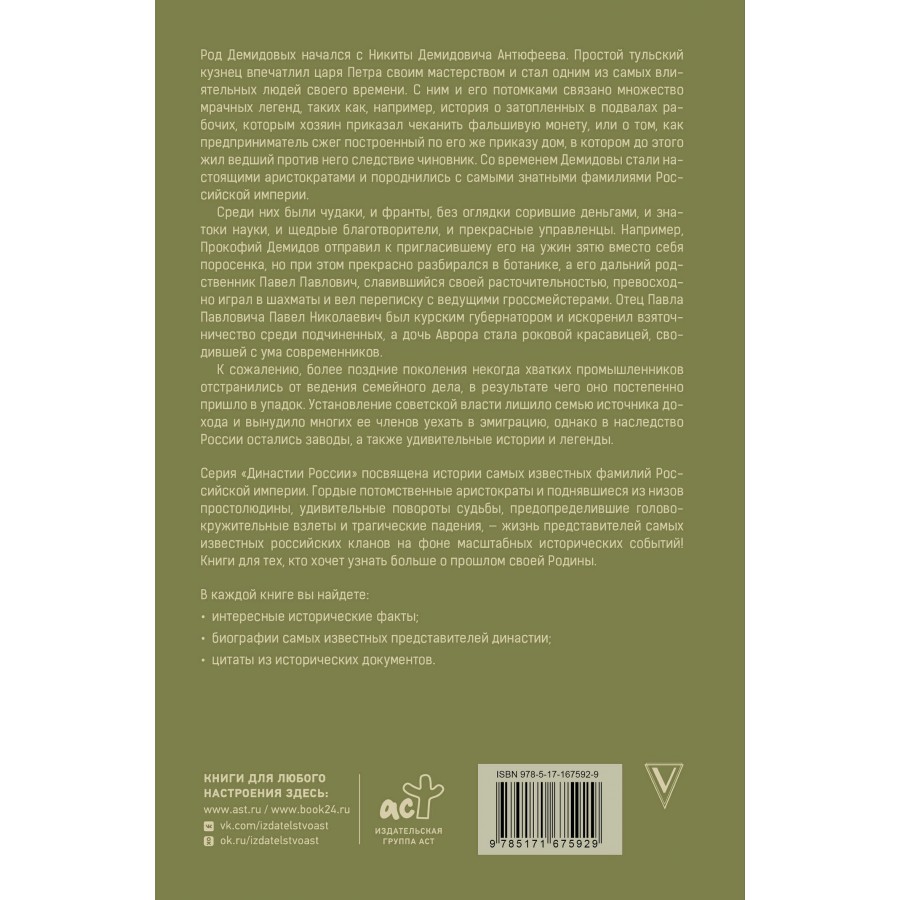 Род Демидовых начался с Никиты Демидовича Антюфеева. Простой тульский кузнец впечатлил царя Петра своим мастерством и стал одним из самых влиятельных людей своего времени. С ним и его потомками связано множество мрачных легенд, таких как, например, история о затопленных в подвалах рабочих, которым хозяин приказал чеканить фальшивую монету, или о том, как предприниматель сжег построенный по его же приказу дом, в котором до этого жил ведший против него следствие чиновник. Со временем Демидовы стали настоящими аристократами и породнились с самыми знатными фамилиями Российской империи.