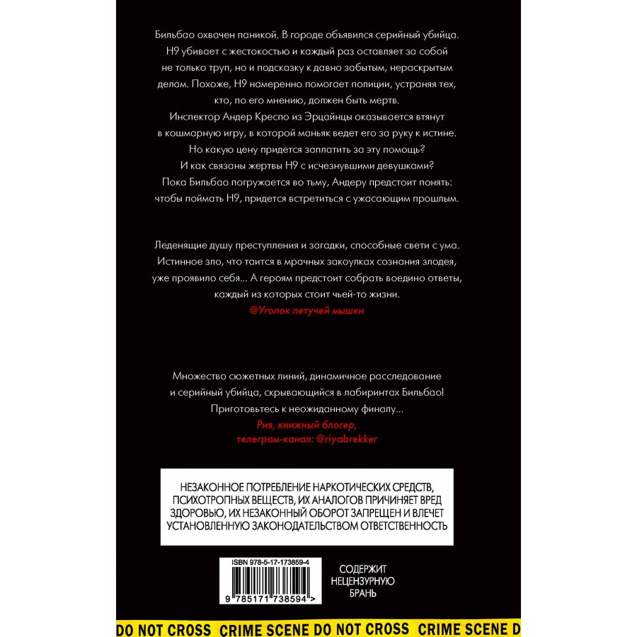 Бильбао охвачен паникой. В городе объявился серийный убийца. Н9 убивает с жестокостью и каждый раз оставляет за собой не только труп, но и подсказку к давно забытым, нераскрытым делам. Похоже, Н9 намеренно помогает полиции, устраняя тех, кто, по его мнению, должен быть мертв. Инспектор Андер Креспо из Эрцайнцы оказывается втянут в кошмарную игру, в которой маньяк ведет его за руку к истине. Но какую цену придется заплатить за эту помощь? И как связаны жертвы Н9 с исчезнувшими девушками? Пока Бильбао погружается во тьму, Андеру предстоит понять: чтобы поймать Н9, придется встретиться с ужасающим прошлым.
