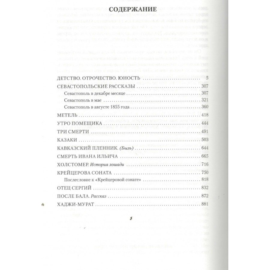 В книгу вошли произведения Толстого разных лет: "Детство. Отрочество. Юность", "Севастопольские рассказы", "Метель", "Утро помещика", "Три смерти", "Казаки", "Кавказский пленник", "Смерть Ивана Ильича", "Холстомер", "Крейцерова соната", "Отец Сергий", "После бала", "Хаджи-Мурат".