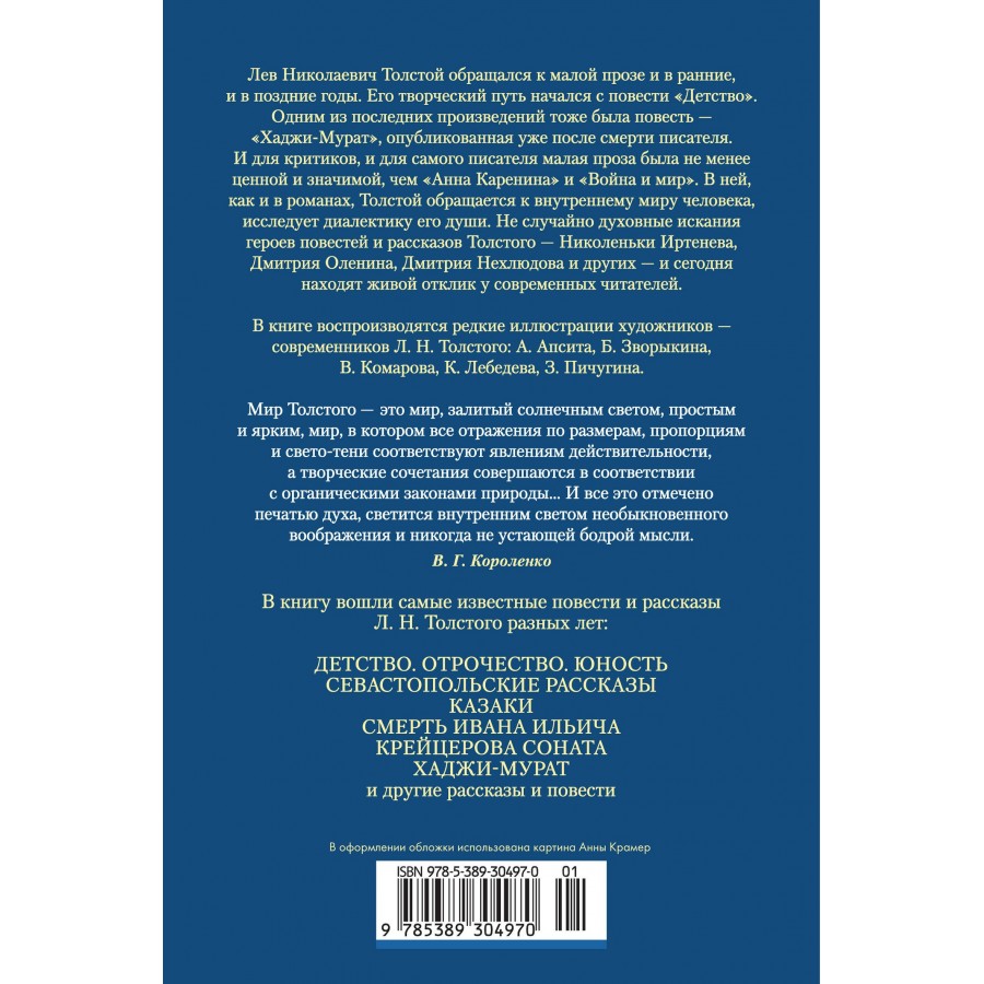 Толстой обращался к малой прозе и в ранние, и в поздние годы. Его творческий путь начался с повести «Детство». Одним из последних произведений тоже была повесть — «Хаджи-Мурат», опубликованная уже после смерти писателя. И для критиков, и для самого писателя малая проза была не менее ценной и значимой, чем «Анна Каренина» и «Война и мир». В ней, как и в романах, Толстой обращается к внутреннему миру человека, исследует диалектику его души. Не случайно духовные искания героев повестей и рассказов Толстого — Николеньки Иртенева, Дмитрия Оленина, Дмитрия Нехлюдова и других — и сегодня находят живой отклик у современных читателей.