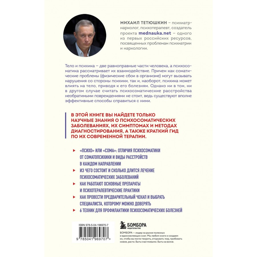 Чтобы сделать книгу не только информативной, но и полезной, доктор Тетюшкин включил в нее различные практические инструменты — тесты для предварительных чек-апов, рекомендации по выбору врача, техники для профилактики психосоматики. Эта книга позволит вам лучше понять суть психосоматических нарушений и их коррекции.