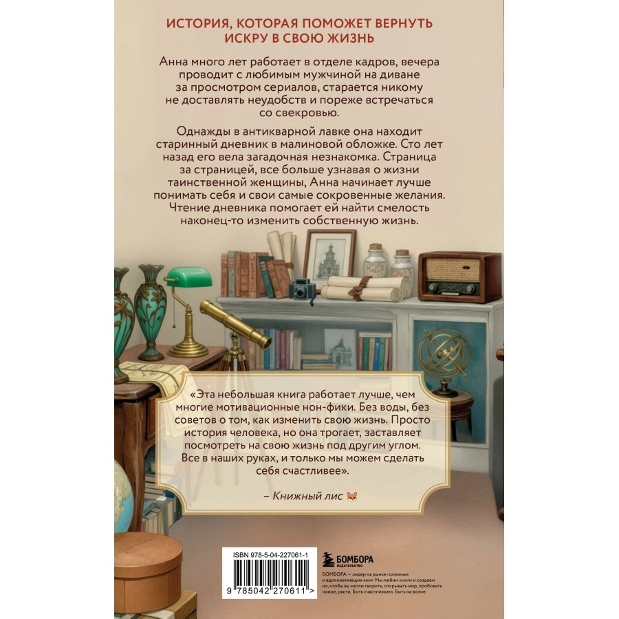 Анна много лет работает в отделе кадров, вечера проводит с любимым мужчиной на диване за просмотром сериалов, старается никому не доставлять неудобств и пореже встречаться со свекровью. Однажды в антикварной лавке она находит старинный дневник в малиновой обложке. Сто лет назад его вела загадочная незнакомка. Страница за страницей, все больше узнавая о жизни таинственной женщины, Анна начинает лучше понимать себя и свои самые сокровенные желания. Чтение дневника помогает ей найти смелость наконец-то изменить собственную жизнь.