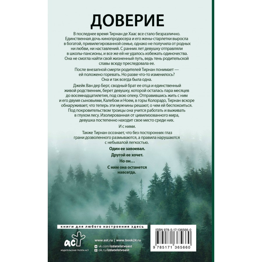 Джейк Ван дер Берг, сводный брат ее отца и единственный живой родственник, берет девушку, которой осталась пара месяцев до восемнадцатилетия, под свою опеку. Отправившись жить с ним и его двумя сыновьями, Калебом и Ноем, в горы Колорадо, Тирнан вскоре обнаруживает, что теперь эти мужчины решают, о чем ей беспокоиться. Под их покровительством она учится работать, выживать в глухом лесу и постепенно находит свое место среди них.