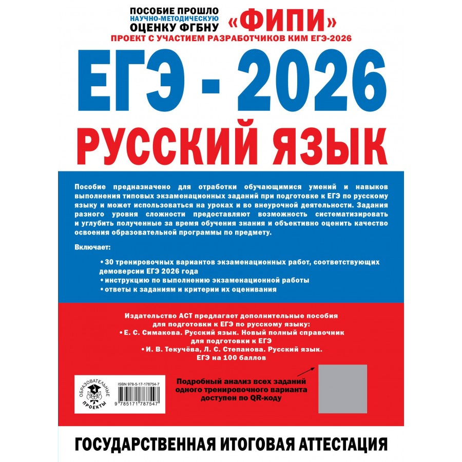 Пособие предназначено для отработки обучающимися умений и навыков выполнения типовых экзаменационных заданий при подготовке к ЕГЭ по русскому языку. Оно включает 30 тренировочных вариантов экзаменационных работ, соответствующих проекту демоверсии ЕГЭ 2026 года, инструкцию по их выполнению, ответы к заданиям и критерии их оценивания.