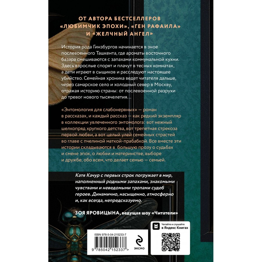 «Энтомология для слабонервных» — роман в рассказах, и каждый рассказ — как редкий экземпляр в коллекции увлечённого энтомолога: вот нежный шелкопряд хрупкого детства, вот трепетная стрекоза первой любви, а вот целый улей семейных страстей во главе с пчелиной маткой-прабабкой.