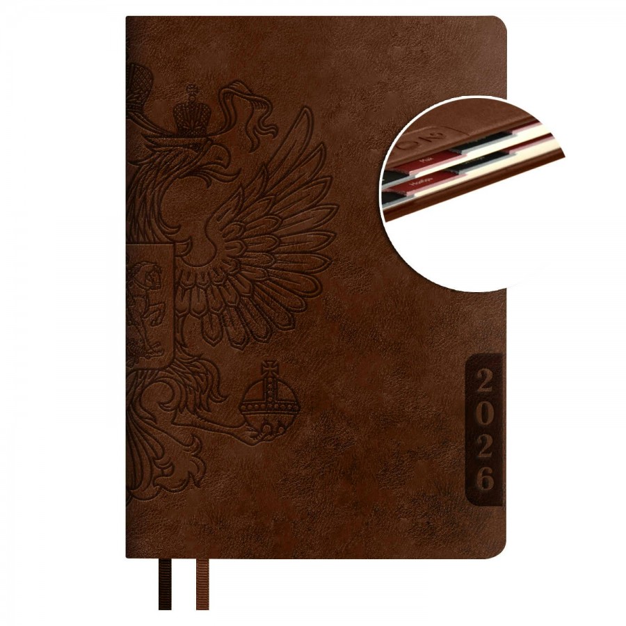 Ежедневник датированный 2026 ESCALADA, А5, 176 л., арт. 70246/ 15 НАППА КОРИЧНЕВЫЙ (кожзам: 146x211 мм, твёрдый переплёт, запаянный край, материал обложки: искусственная кожа "Наппа"; декор: блинтовое тиснение; способ крепления блока: ниткошвейный; вн. блок: 176 л., кремовый офсет 70 г/м?, печать в две краски (линия), справочный материал: есть; перфорация углов блока: есть; закладка/-и: два ляссе; каптал: есть; форзац: печать пантоном; особенности: вырубка блока по месяцам; персонализация возможна: да; индивидуальная упаковка: ПЭТ-пакет)