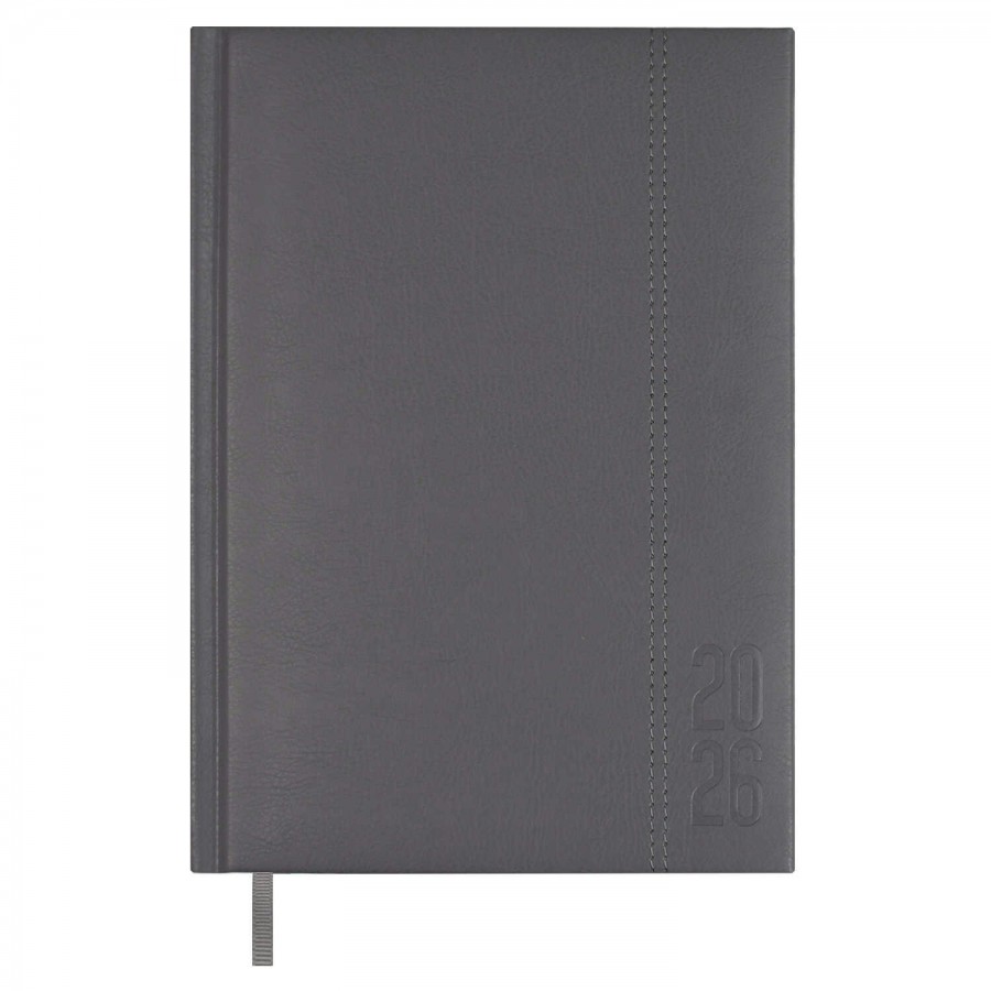 Ежедневник датированный 2026 ESCALADA, А5, 176 л., арт. 70229/ 15 НАППА СЕРЫЙ (кожзам: 146х211 мм, твёрдый переплёт с поролоном, материал обложки: искусственная кожа "Наппа"; декор: блинтовое тиснение, отделочная строчка; способ крепления блока: ниткошвейный; вн. блок: 176 л., белый офсет 70 г/м?, печать в одну краску (линия), справочный материал: есть; перфорация углов блока: нет; закладка/-и: одно ляссе; каптал: есть; форзац: без печати; персонализация возможна: да; индивидуальная упаковка: промостикер + ПЭТ-пакет)