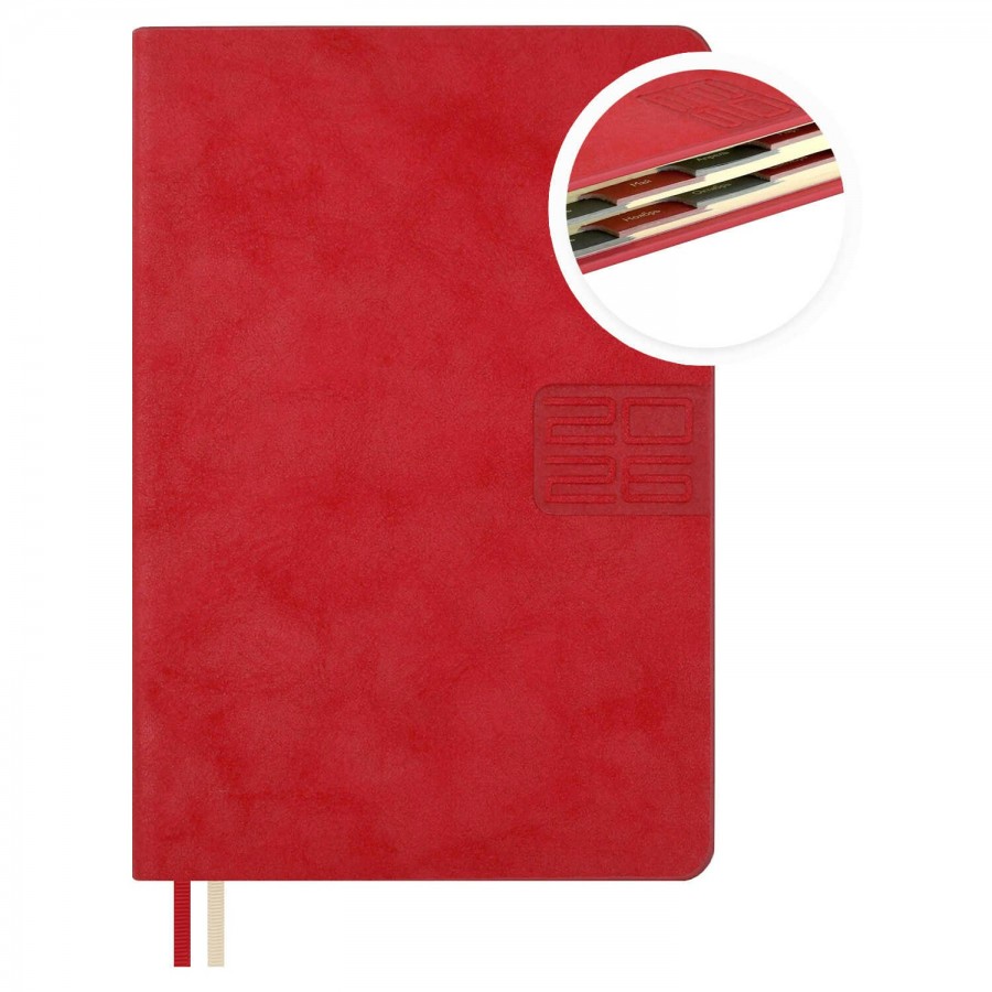 Ежедневник датированный 2026 ESCALADA, #ДУМАЙ КАК МИЛЛИАРДЕР, А6+, 176 л., арт. 70293/ 20 ТИВОЛИ ГЛОСС КРАСНЫЙ (кожзам: 126x174 мм, твёрдый переплёт, запаянный край, материал обложки: искусственная кожа "Тиволи глосс"; декор: блинтовое тиснение; способ крепления блока: ниткошвейный; вн. блок: 176 л., тонированный офсет 70 г/м?, печать в две краски (линия), справочный материал: есть; перфорация углов блока: есть; закладка/-и: два ляссе; каптал: есть; форзац: печать пантоном; особенности: вырубка блока по месяцам, в блоке использованы мотивирующие высказывания экстраординарной личности, предпринимателя и миллиардера, титулованного «Провидца века», шоумена и телеведущего, бывшего владельца конкурса красоты «Мисс Вселенная» и дважды президента США – Дональда Трампа; персонализация возможна: да; индивидуальная упаковка: промостикер + ПЭТ-пакет)