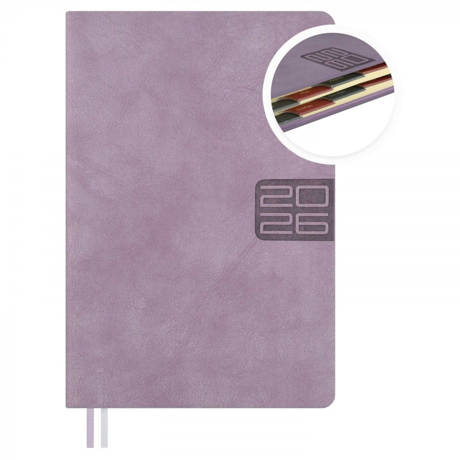 Ежедневник датированный 2026 ESCALADA, #ДУМАЙ КАК МИЛЛИАРДЕР, А6+, 176 л., арт. 70296/ 20 ТИВОЛ ГЛОСС СИРЕНЕВЫЙ (кожзам: 126x174 мм, твёрдый переплёт, запаянный край, материал обложки: искусственная кожа "Тиволи глосс"; декор: блинтовое тиснение; способ крепления блока: ниткошвейный; вн. блок: 176 л., тонированный офсет 70 г/м?, печать в две краски (линия), справочный материал: есть; перфорация углов блока: есть; закладка/-и: два ляссе; каптал: есть; форзац: печать пантоном; особенности: вырубка блока по месяцам, в блоке использованы мотивирующие высказывания экстраординарной личности, предпринимателя и миллиардера, титулованного «Провидца века», шоумена и телеведущего, бывшего владельца конкурса красоты «Мисс Вселенная» и дважды президента США – Дональда Трампа; персонализация возможна: да; индивидуальная упаковка: промостикер + ПЭТ-пакет)