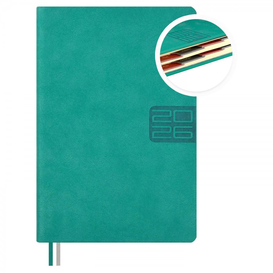 Ежедневник датированный 2026 ESCALADA, #ДУМАЙ КАК МИЛЛИАРДЕР, А6+, 176 л., арт. 70295/ 20 ТИВОЛИ ГЛОСС БИРЮЗОВЫЙ (кожзам: 126x174 мм, твёрдый переплёт, запаянный край, материал обложки: искусственная кожа "Тиволи глосс"; декор: блинтовое тиснение; способ крепления блока: ниткошвейный; вн. блок: 176 л., тонированный офсет 70 г/м?, печать в две краски (линия), справочный материал: есть; перфорация углов блока: есть; закладка/-и: два ляссе; каптал: есть; форзац: печать пантоном; особенности: вырубка блока по месяцам, в блоке использованы мотивирующие высказывания экстраординарной личности, предпринимателя и миллиардера, титулованного «Провидца века», шоумена и телеведущего, бывшего владельца конкурса красоты «Мисс Вселенная» и дважды президента США – Дональда Трампа; персонализация возможна: да; индивидуальная упаковка: промостикер + ПЭТ-пакет)