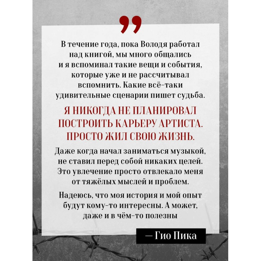 Писатель Владимир Еркович провел большое количество времени с самим Гио и его близкими людьми и восстановил весь путь становления Георгия: от тяжелого детства в небольшом городе до формирования одного из самых ярких артистов эпохи. Лаконичное оформление книги делает ее отличным артефактом для домашней библиотеки каждого, кто уважает творчество артиста.