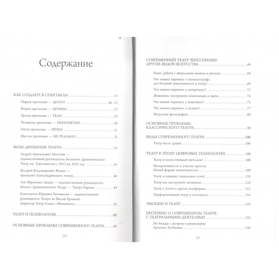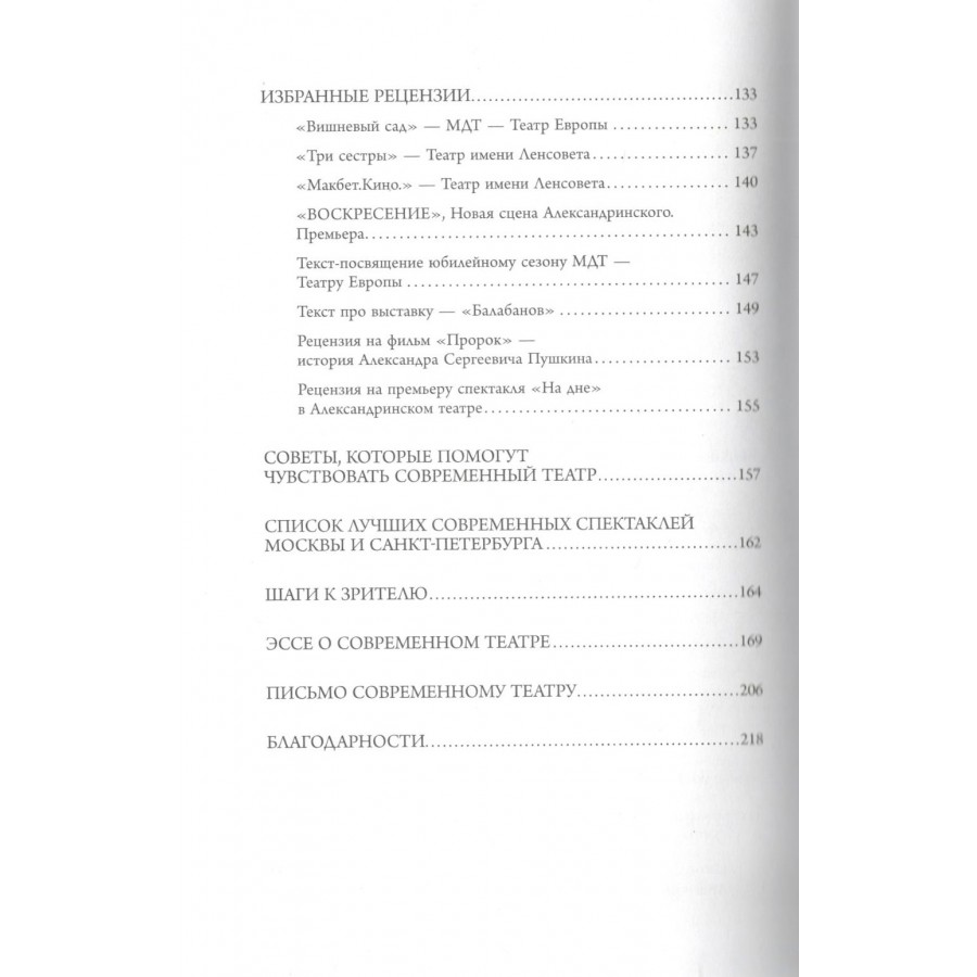 В центре внимания книги — не столько рациональное понимание спектакля, сколько умение чувствовать, проживать и эмоционально откликаться на сценическое действие. Автор убеждён: современный театр — это пространство живого диалога, смелых споров и поиска истины.