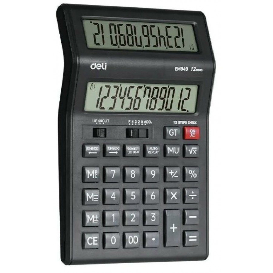 Калькулятор настольный Deli, EM049, два дисплея, 12 разрядов, 202х135,5х28,5 мм, питание от батарейки, функция проверки 120 шагов, черный