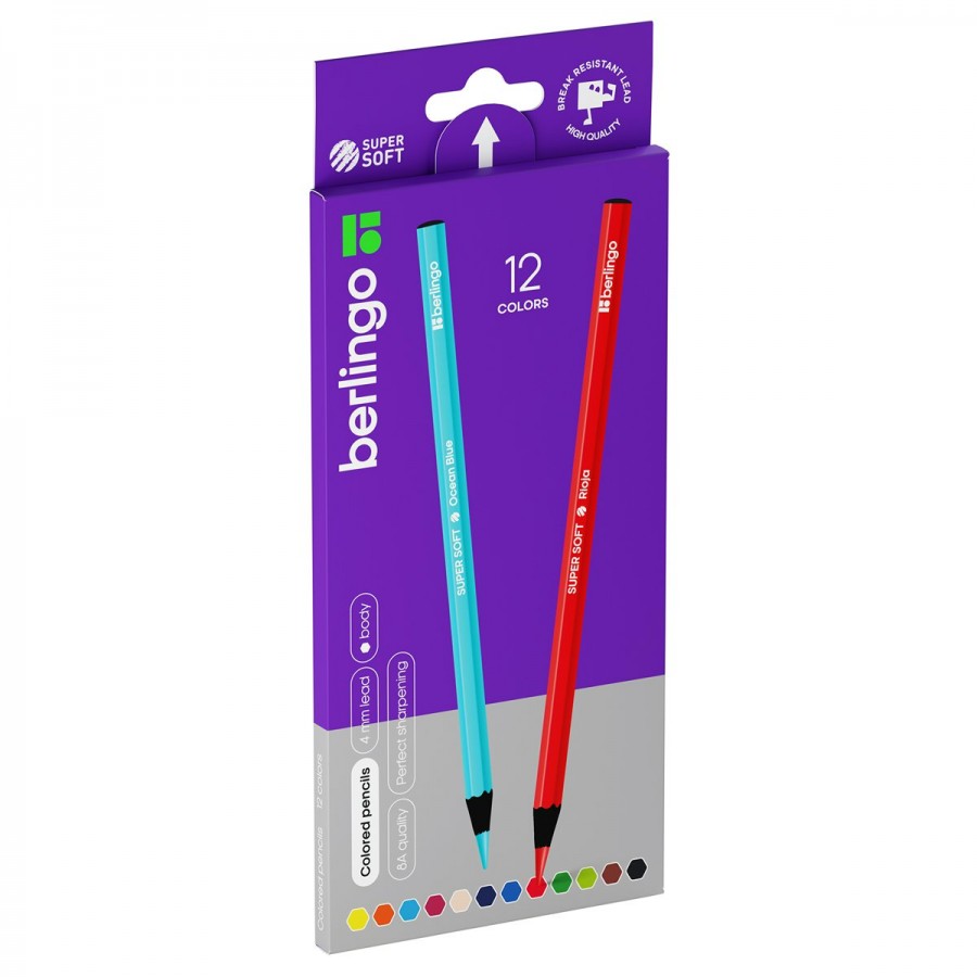 "SuperSoft" - линейка качественно новых цветных карандашей Berlingo. 12 цветов. Черное дерево. Шестигранная форма. Указание цвета на каждом карандаше на английском языке. Поле для подписи имени владельца на каждом карандаше. Упаковка в плотную матовую картонную коробку со склеенным европодвесом.