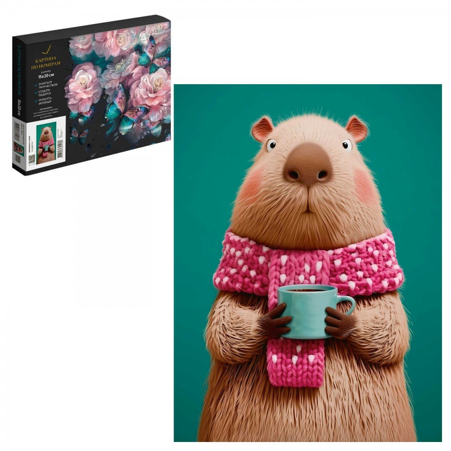 Набор для творчества Картина по номерам арт. 71239 / 50 КАПИБАРА С КОФЕ, размер: 15х20 см, (14 цвета (-ов), холст на деревянном подрамнике с напечатанной схемой рисунка, контрольный лист с нанесенной схемой, краски акриловые на водной основе (упакованы в вакуумную упаковку), кисти художественные с ворсом из нейлона – 4 шт., подвесы для подрамника, пакет на zip-молнии, лак в комплекте, картонная коробка)