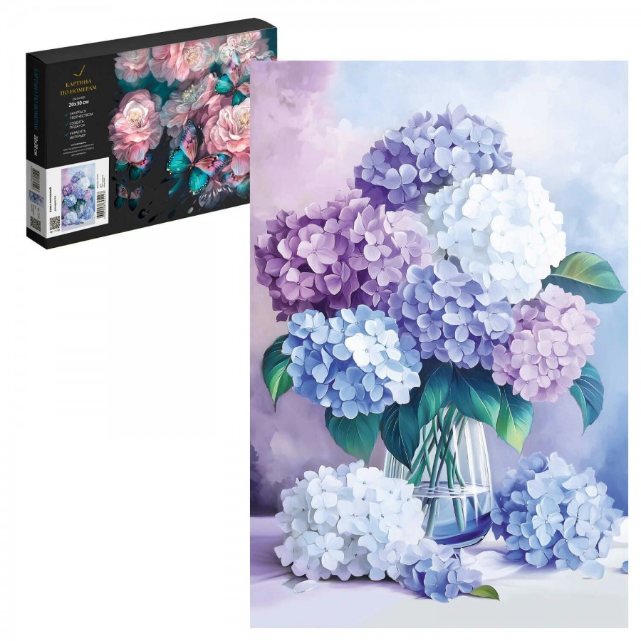 Набор для творчества Картина по номерам арт. 71243 / 40 БУКЕТ ГОРТЕНЗИЙ, размер: 20х30 см, (15 цвета (-ов), холст на деревянном подрамнике с напечатанной схемой рисунка, контрольный лист с нанесенной схемой, краски акриловые на водной основе (упакованы в вакуумную упаковку), кисти художественные с ворсом из нейлона – 4 шт., подвесы для подрамника, пакет на zip-молнии, лак в комплекте, картонная коробка)