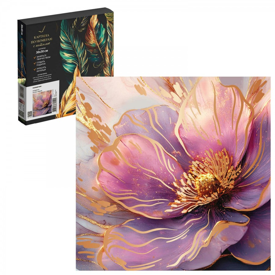 Набор для творчества Картина по номерам с поталью арт. 71273 / 30 РОЗОВЫЙ МАК, размер: 30x30 см, (15 цвета (-ов), холст на деревянном подрамнике с напечатанной схемой рисунка, краски акриловые на водной основе (упакованы в вакуумную упаковку), кисти художественные с ворсом из нейлона – 4 шт., поталь, клей для потали, лак, пакет на zip-молнии, подвесы для подрамника, контрольный лист с нанесенной схемой в комплекте, поталь: медная, картонная коробка)