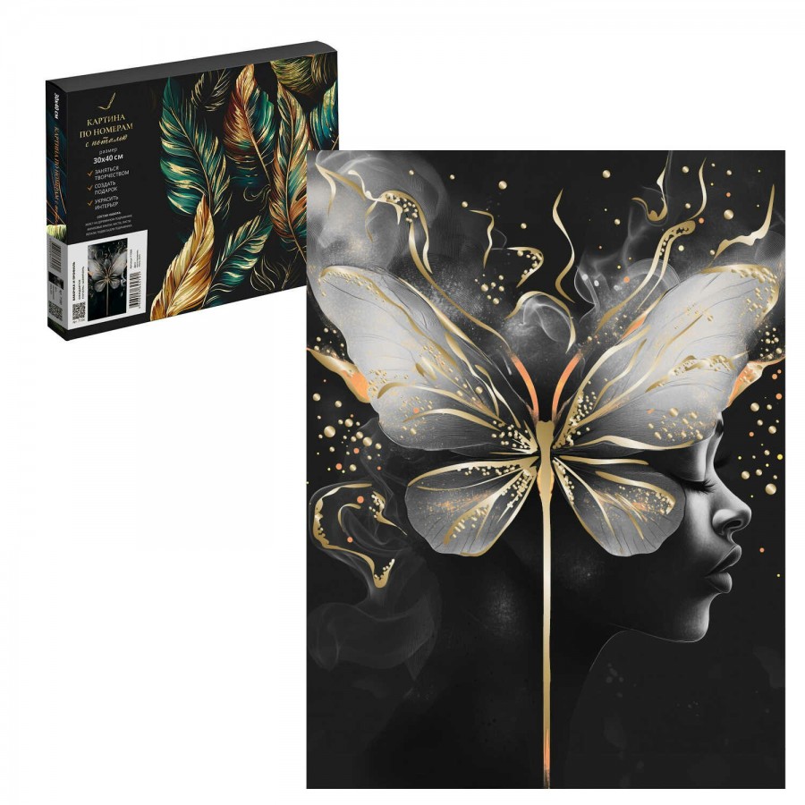 Набор для творчества Картина по номерам с поталью на черном холсте арт. 71300 / 24 ДЕВУШКА С БАБОЧКОЙ, размер: 30х40 см, (13 цвета (-ов), холст на деревянном подрамнике с напечатанной схемой рисунка, краски акриловые на водной основе (упакованы в вакуумную упаковку), кисти художественные с ворсом из нейлона – 4 шт., поталь, клей для потали, лак, пакет на zip-молнии, подвесы для подрамника, контрольный лист с нанесенной схемой в комплекте, черный холст, поталь: шампань, картонная коробка с ручкой)