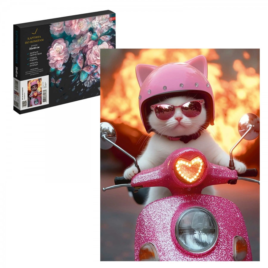 Набор для творчества Картина по номерам арт. 71257 / 24 КОТ НА МОТОЦИКЛЕ, размер: 30х40 см, (19 цвета (-ов), холст на деревянном подрамнике с напечатанной схемой рисунка, контрольный лист с нанесенной схемой, краски акриловые на водной основе (упакованы в вакуумную упаковку), кисти художественные с ворсом из нейлона – 4 шт., подвесы для подрамника, пакет на zip-молнии, лак в комплекте, картонная коробка с ручкой)