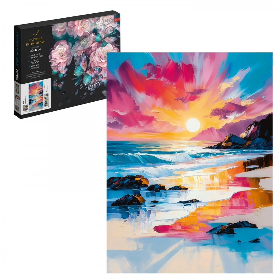 Набор для творчества Картина по номерам арт. 71251 / 24 МОРЕ, размер: 30х40 см, (20 цвета (-ов), холст на деревянном подрамнике с напечатанной схемой рисунка, контрольный лист с нанесенной схемой, краски акриловые на водной основе (упакованы в вакуумную упаковку), кисти художественные с ворсом из нейлона – 4 шт., подвесы для подрамника, пакет на zip-молнии, лак в комплекте, картонная коробка с ручкой)