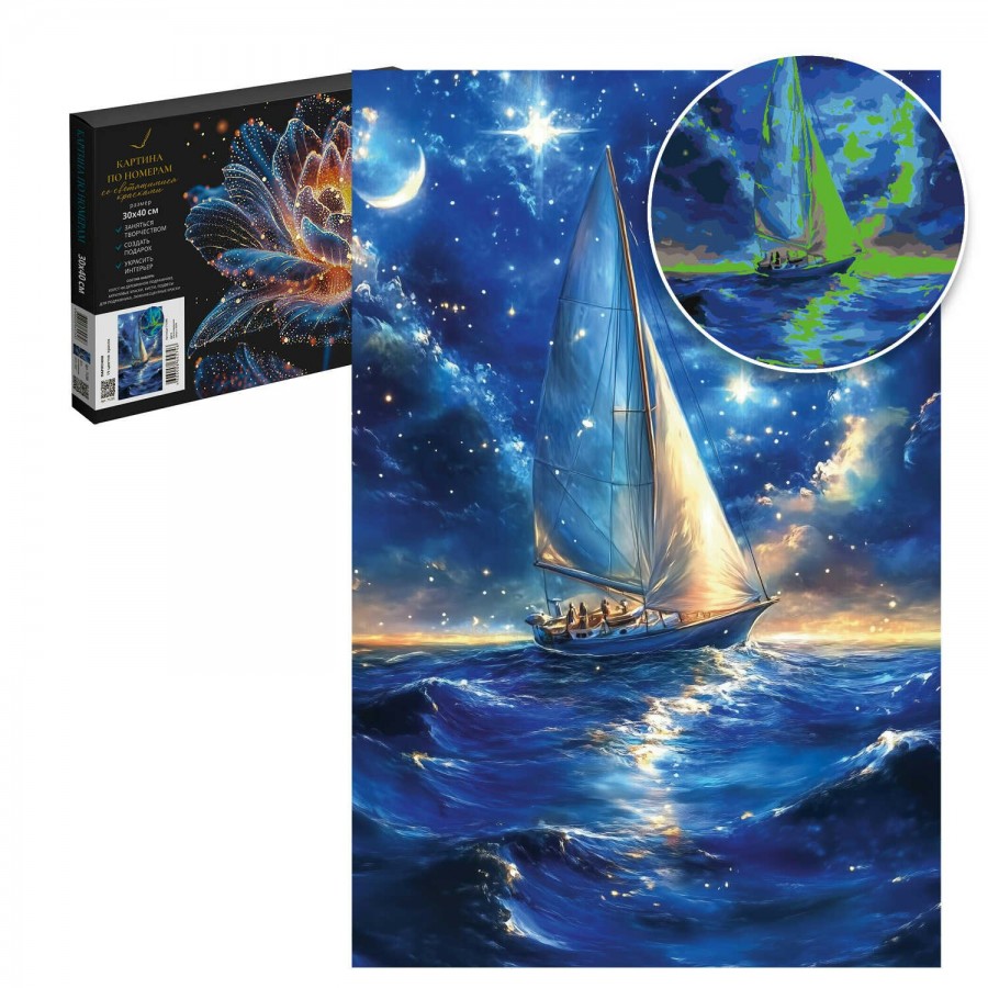 Набор для творчества Картина по номерам со светящимися красками арт. 71295 / 24 ПАРУСНИК, размер: 30х40 см, (19 цвета (-ов), холст на деревянном подрамнике с напечатанной схемой рисунка, краски акриловые на водной основе (упакованы в вакуумную упаковку), люминесцентные (светящиеся в темноте) краски, кисти художественные с ворсом из нейлона – 4 шт., лак, пакет на zip-молнии, подвесы для подрамника, контрольный лист с нанесенной схемой в комплекте, картонная коробка с ручкой)