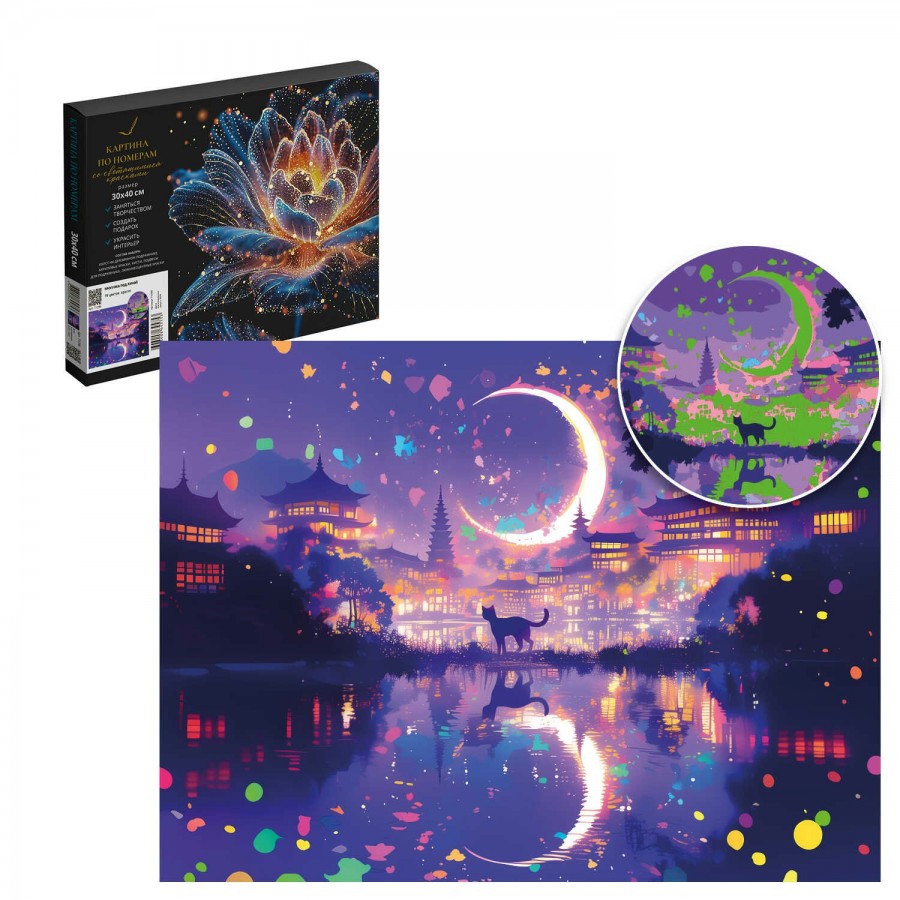 Набор для творчества Картина по номерам со светящимися красками арт. 71296 / 24 ПРОГУЛКА ПОД ЛУНОЙ, размер: 30х40 см, (19 цвета (-ов), холст на деревянном подрамнике с напечатанной схемой рисунка, краски акриловые на водной основе (упакованы в вакуумную упаковку), люминесцентные (светящиеся в темноте) краски, кисти художественные с ворсом из нейлона – 4 шт., лак, пакет на zip-молнии, подвесы для подрамника, контрольный лист с нанесенной схемой в комплекте, картонная коробка с ручкой)