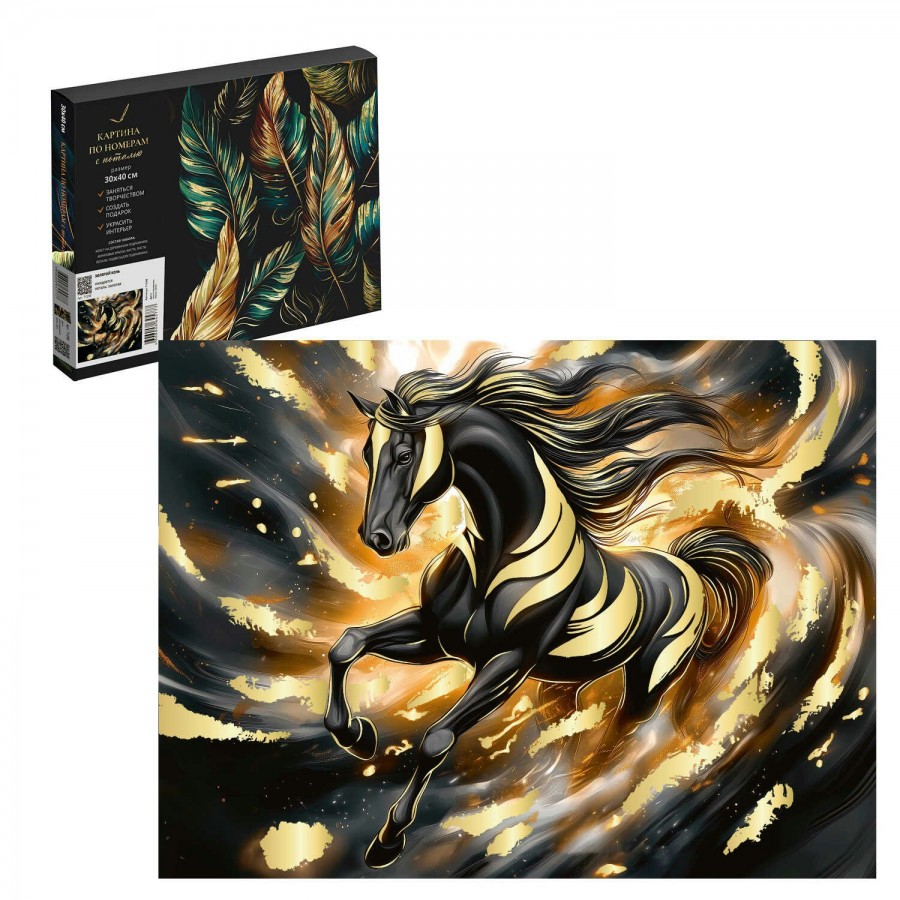 Набор для творчества Картина по номерам с поталью на черном холсте арт. 71298 / 24 ЗОЛОТОЙ КОНЬ, размер: 30х40 см, (14 цвета (-ов), холст на деревянном подрамнике с напечатанной схемой рисунка, краски акриловые на водной основе (упакованы в вакуумную упаковку), кисти художественные с ворсом из нейлона – 4 шт., поталь, клей для потали, лак, пакет на zip-молнии, подвесы для подрамника, контрольный лист с нанесенной схемой в комплекте, черный холст, поталь: золотая, картонная коробка с ручкой)