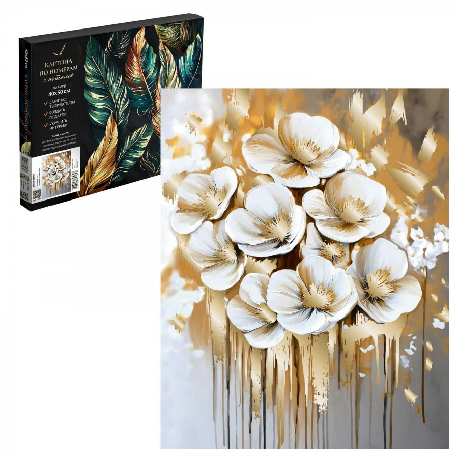 Набор для творчества Картина по номерам с поталью арт. 71285 / 16 БЕЛЫЕ ЦВЕТЫ, размер: 40х50 см, (23 цвета (-ов), холст на деревянном подрамнике с напечатанной схемой рисунка, краски акриловые на водной основе (упакованы в вакуумную упаковку), кисти художественные с ворсом из нейлона – 4 шт., поталь, клей для потали, лак, пакет на zip-молнии, подвесы для подрамника, контрольный лист с нанесенной схемой в комплекте, поталь: шампань, картонная коробка с ручкой)
