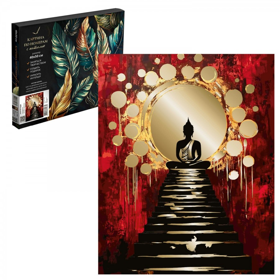Набор для творчества Картина по номерам с поталью арт. 71284 / 16 ЗОЛОТОЙ БУДДА, размер: 40х50 см, (22 цвета (-ов), холст на деревянном подрамнике с напечатанной схемой рисунка, краски акриловые на водной основе (упакованы в вакуумную упаковку), кисти художественные с ворсом из нейлона – 4 шт., поталь, клей для потали, лак, пакет на zip-молнии, подвесы для подрамника, контрольный лист с нанесенной схемой в комплекте, поталь: шампань, картонная коробка с ручкой)