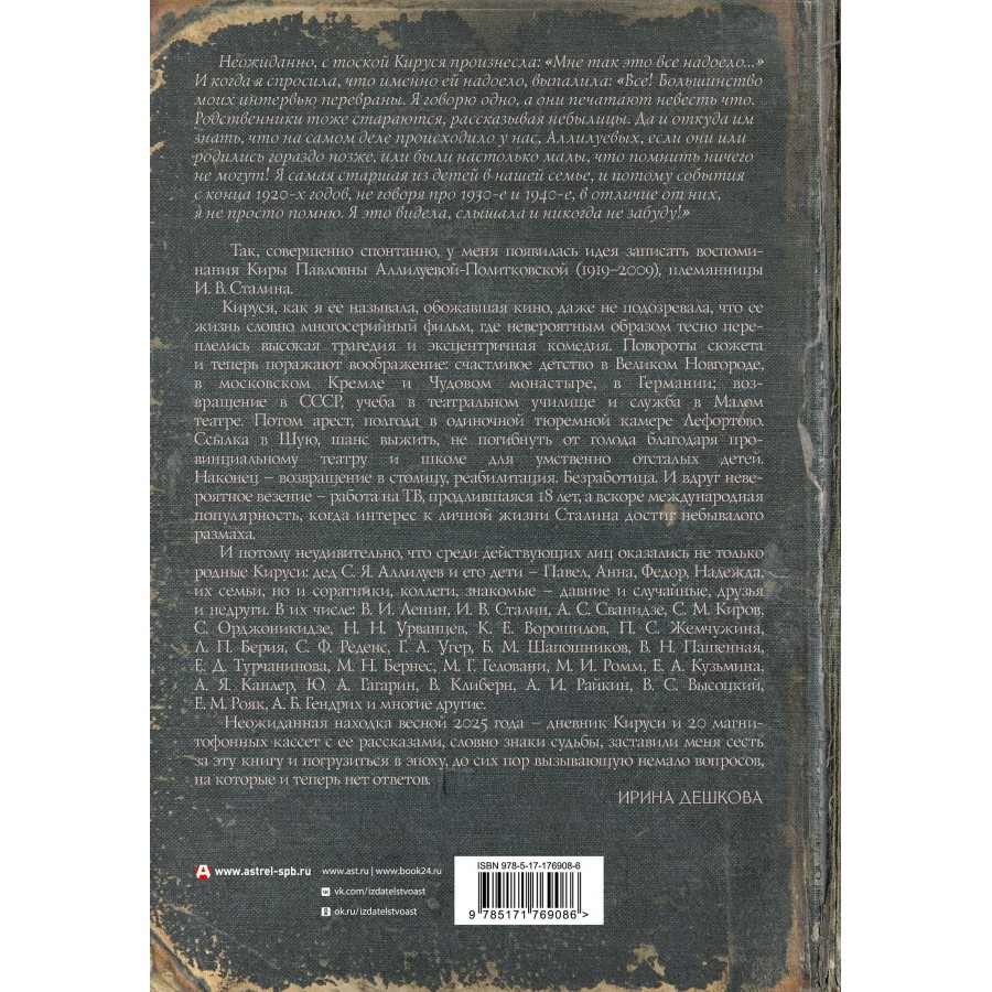 Неожиданно с тоской Кируся произнесла: "Мне так это все надоело. Большинство моих интервью перевраны. Я говорю одно, а печатают невесть что. Родственники тоже стараются, рассказывая небылицы. Да и откуда им знать, что на самом деле происходило у нас, Аллилуевых, если они или родились гораздо позже, или были настолько малы, что помнить ничего не могут! Я самая старшая из детей в нашей семье и потому события с конца 1920-х годов, не говоря про 1930-е и 1940-е, в отличие от них, я не просто помню. Я это видела, слышала и никогда не забуду!" Так появилась идея записать воспоминания Киры Павловны Аллилуевой-Политковской (1919—2009), племянницы И. В. Сталина. Неожиданная находка весной 2025 года — дневник Кируси и ее рассказы, словно знаки судьбы, заставили меня сесть за эту книгу и погрузиться в эпоху, до сих пор вызывающую немало вопросов, на которые и теперь нет ответов. Среди ее героев Аллилуев и его дети — Павел, Анна, Федор, Надежда, их семьи, соратники, знакомые — давние и случайные, друзья и недруги: Ленин, Сталин, Сванидзе, Киров, Орджоникидзе, Ворошилов, Берия, Реденс, Шапошников, Бернес, Геловани, Ромм, Каплер, Гагарин, Райкин, Высоцкий и многие другие.