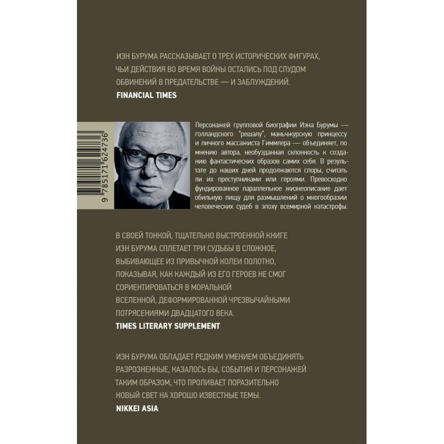 Казалось бы, что общего между голландским евреем-“решалой”, маньчжурской принцессой и личным массажистом Гиммлера? Однако именно они стали центральными персонажами групповой биографии Иэна Бурумы. По мнению автора, их объединяет необузданная склонность к созданию фантастических образов самих себя. В результате до сих пор продолжаются споры, считать ли их преступниками или героями. Превосходно фундированное параллельное жизнеописание дает обильную пищу для размышлений о многообразии человеческих судеб в эпоху всемирной катастрофы.