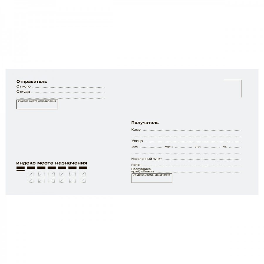 Конверты OfficeSpace формата Е65 (DL) используются для почтовой и курьерской отправки писем, уведомлений и других бумаг, а также хранения информации. Конверт изготовлен из качественной офсетной бумаги белого цвета плотностью 80 г/м?. На лицевой стороне имеются графы для заполнения. В левом верхнем углу «От кого», «Откуда», в правом нижнем углу «Кому», «Куда», а также блок для написания почтового индекса. Для надежного запечатывания в верхней части конверта располагается закрывающий клапан с нанесением клеевой силиконовой полосы типа стрип, защищенной специальной отрывной лентой.