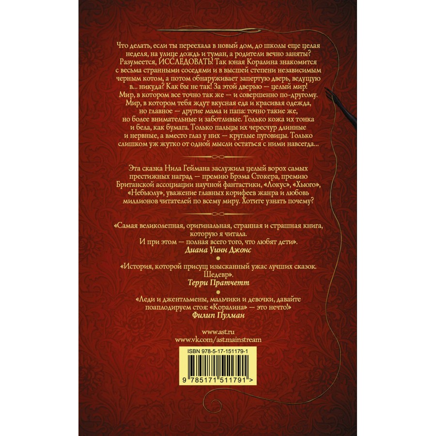 Что делать, если ты переехала в новый дом, до школы еще целая неделя, на улице дождь и туман, а родители вечно заняты? Разумеется, исследовать! Так юная Коралина знакомится с весьма странными соседями и в высшей степени независимым черным котом, а потом обнаруживает запертую дверь, ведущую в… никуда? Как бы не так! За этой дверью - целый мир! Мир, в котором все точно так же - и совершенно по-другому.
