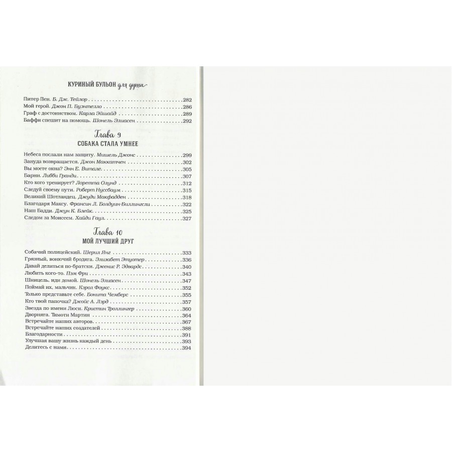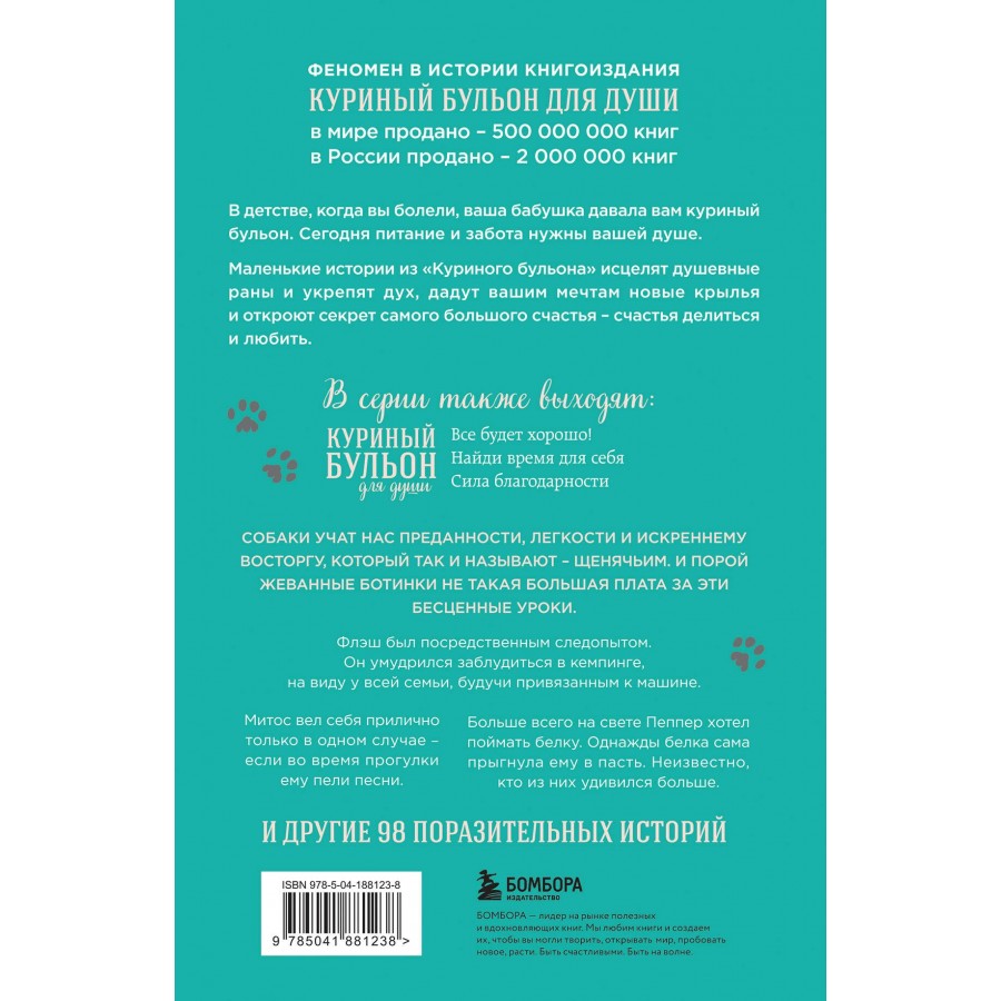 В новую книгу серии «Куриный бульон для души» вошли забавные и трогательные истории о самых верных хвостатых товарищах — собаках. Собаки учат нас преданности, легкости и искреннему восторгу, который так и называют — щенячьим. И порой пожеванные ботинки не такая большая плата за эти бесценные уроки.