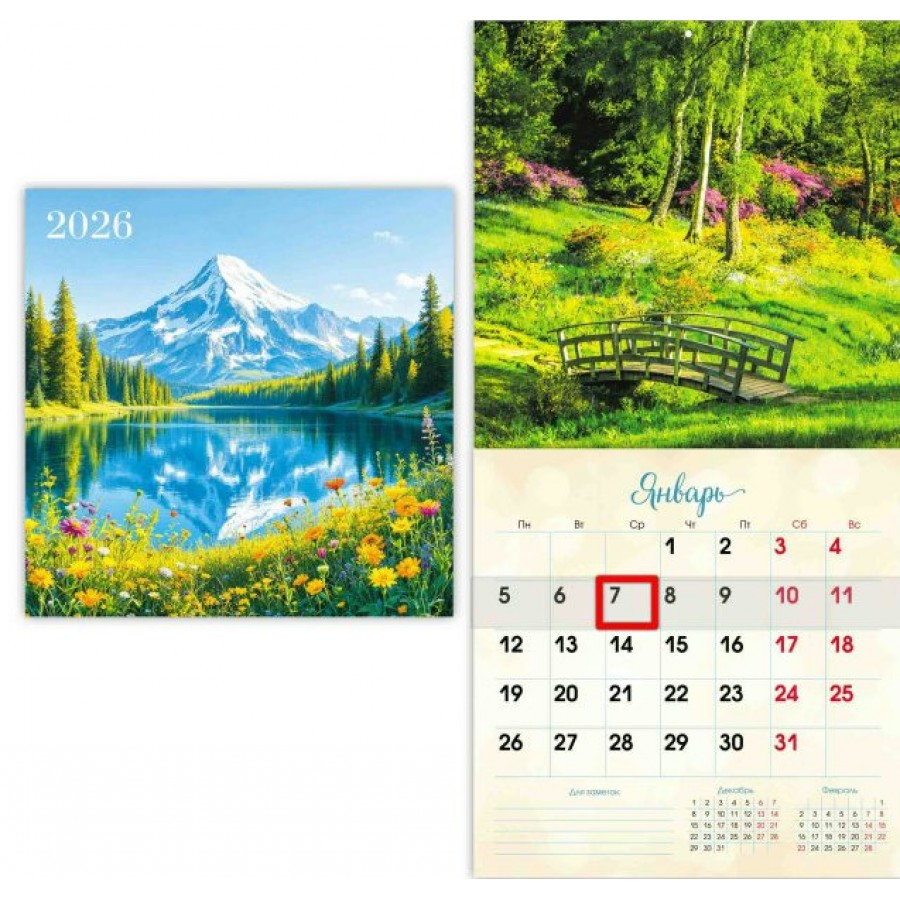 Квадра/Календарь настенный перекидной на скрепке с курсором 2026. Природа 290 х 290/9765/