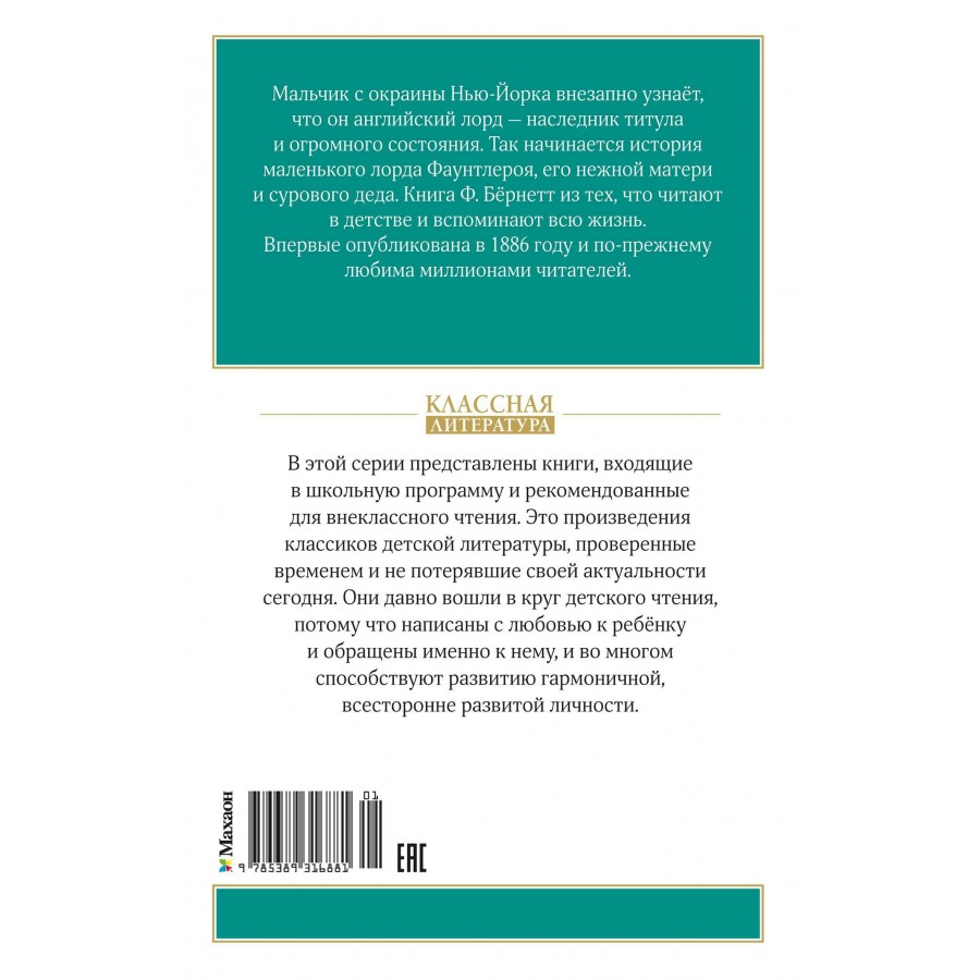 Мальчик с окраины Нью-Йорка внезапно узнает, что он английский лорд — наследник титула и огромного состояния. Так начинается приключение маленького лорда Фаунтлероя, его нежной матери и сурового деда. Книга Ф. Бёрнетт из тех, что читают в детстве и вспоминают всю жизнь. Впервые опубликована в 1886 году и по-прежнему любима миллионами читателей. Настоящая классика детской литературы. Захватывающая и трогательная повесть будет интересна мальчикам и девочкам.