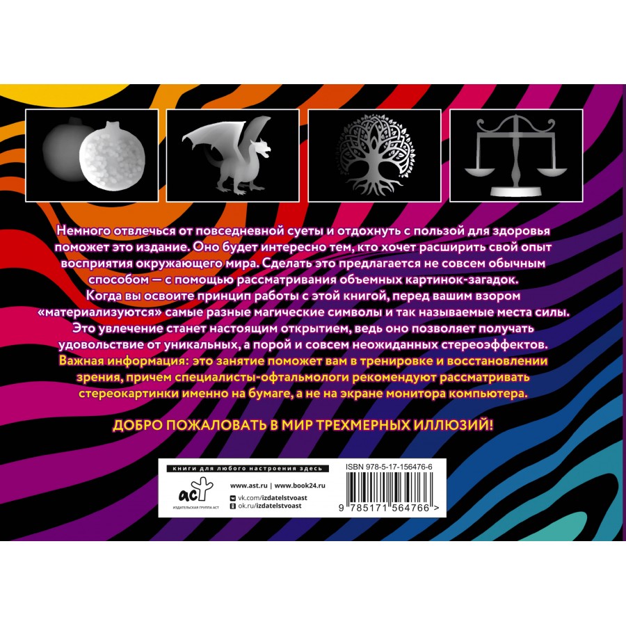 Это издание будет интересно тем, кто хочет расширить свой опыт восприятия окружающего мира. Сделать это предлагается не совсем обычным способом - с помощью рассматривания объемных картинок-загадок. Когда вы освоите принцип работы с книгой, перед вашим взором "материализуются" самые разные магические символы и так называемые места силы. Это занятие может стать настоящим открытием, оно позволит получить удовольствие от уникальных, а порой совсем неожиданных стереоэффектов.